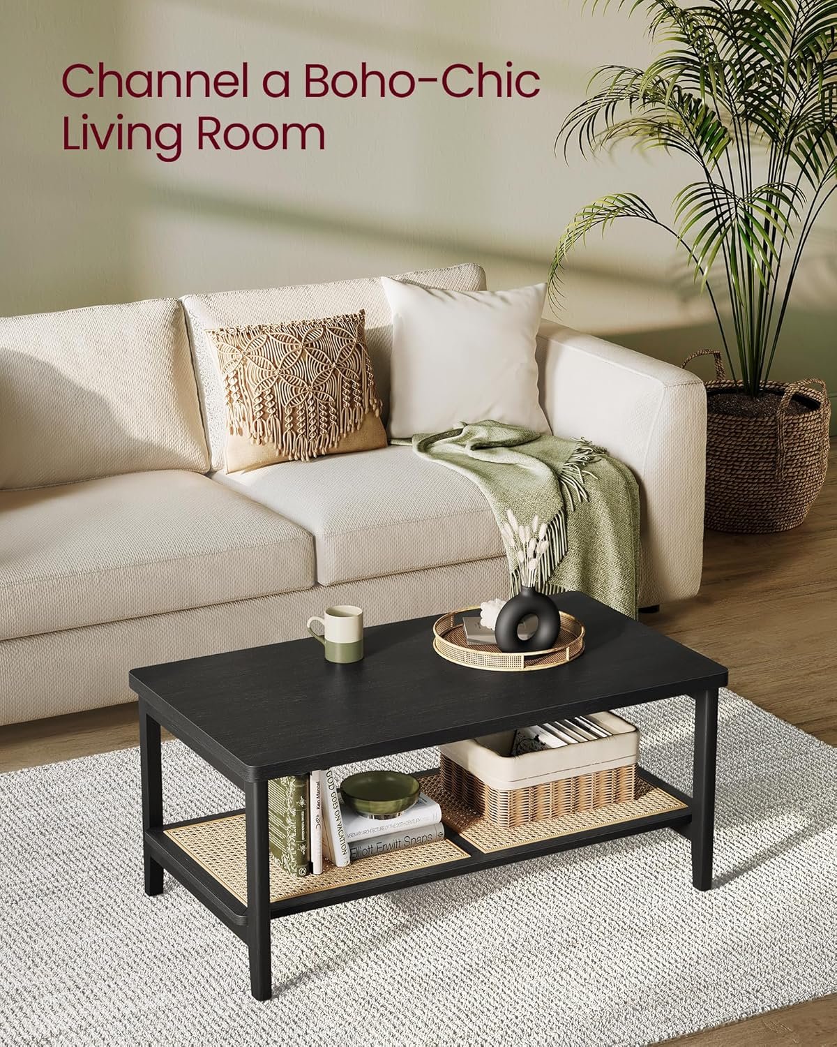 VASAGLE 2-Tier Coffee Table for Living Room, Living Room Table Rectangular Center Table, with PVC Rattan Storage Shelf, Rounded Corners, Easy Assembly, Boho Style, Ash Black ULCT240B21