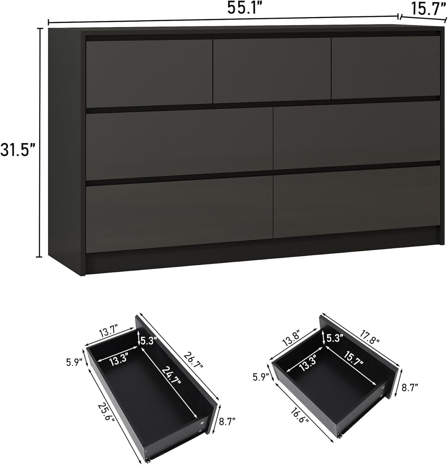 【Glossy handle-less design】Different from ordinary 55 inch long dresser for bedroom, our black 7 drawers malm dresser has a high-gloss front, adding a charming touch to your room. The unique beveled design of the drawers is full of modern elements. This large modern dresser with seven deep drawers can be matched with various themed homes.