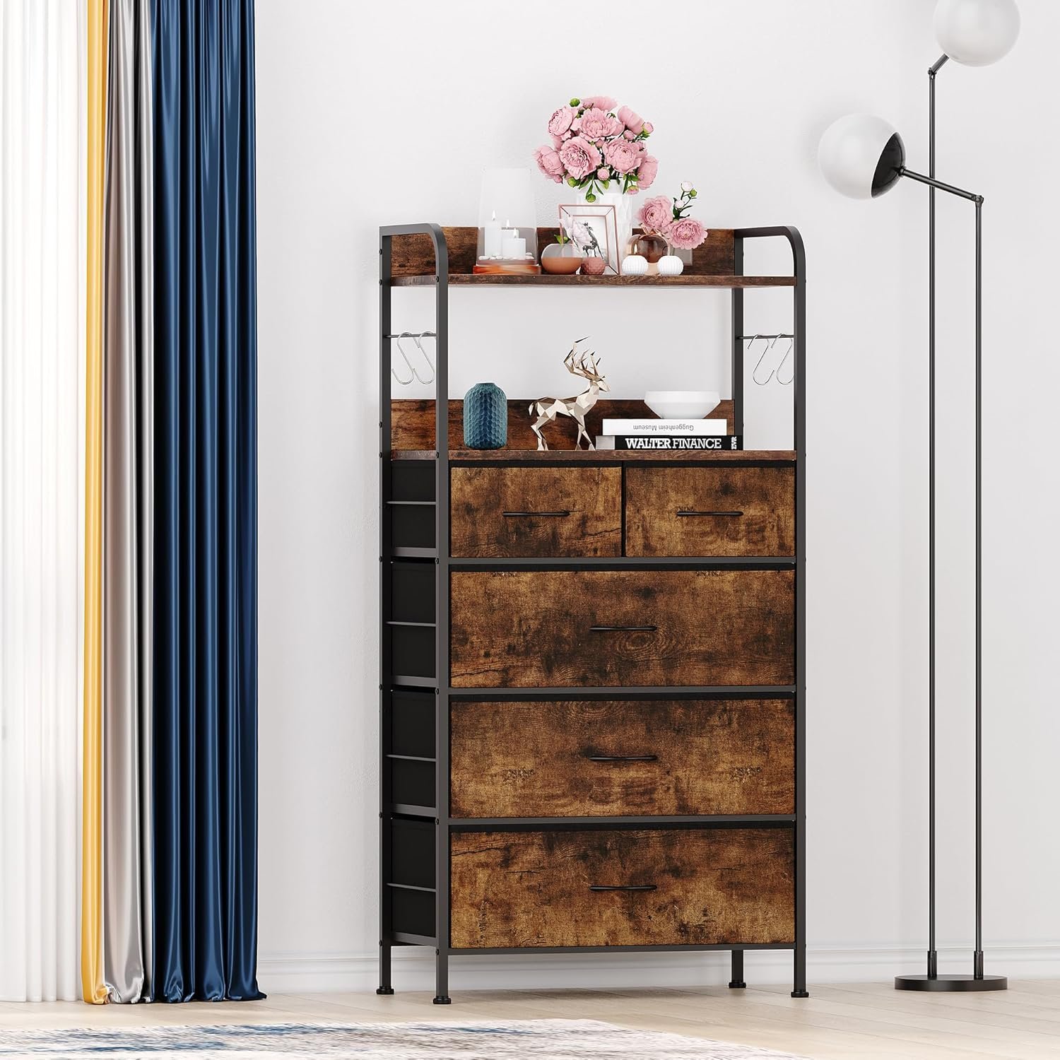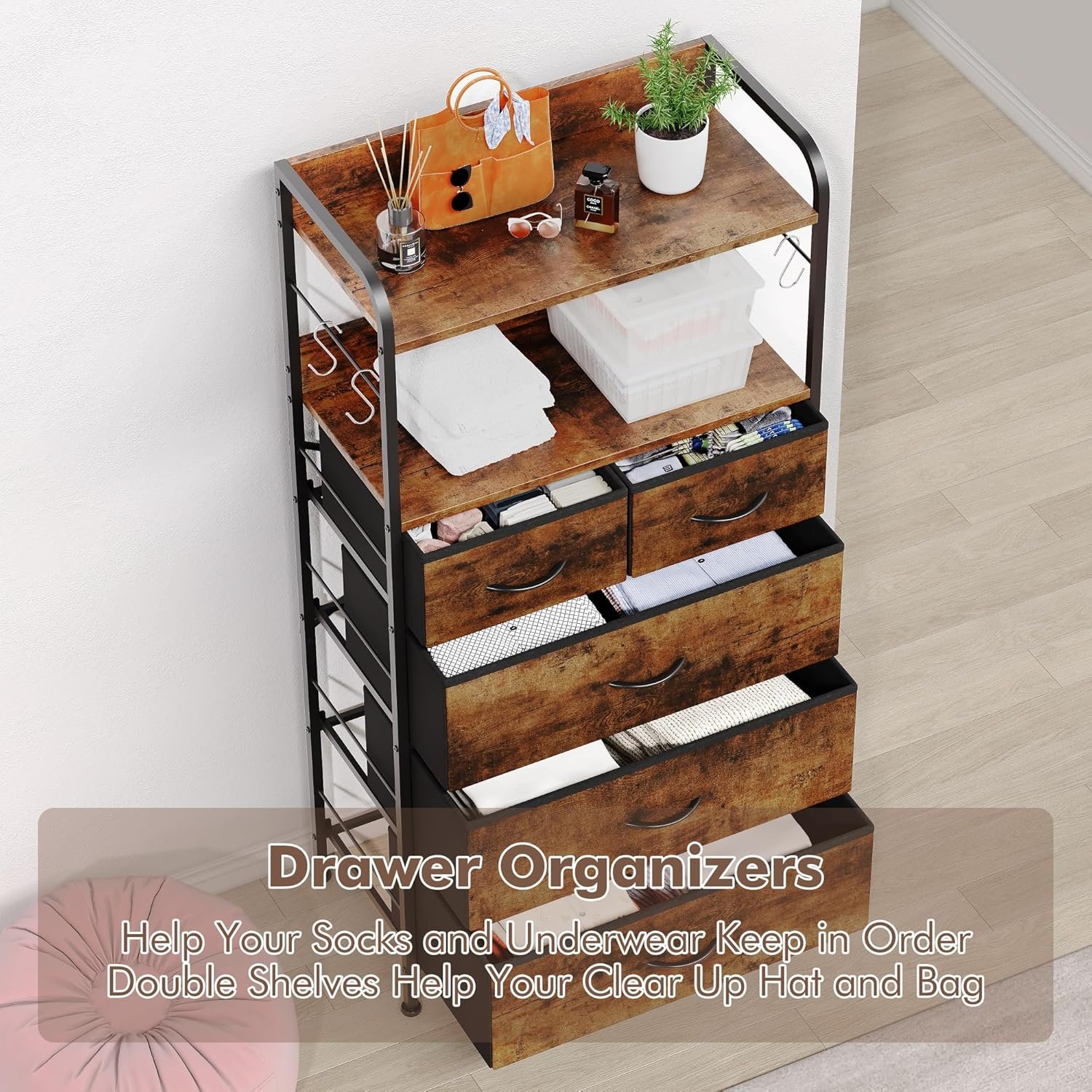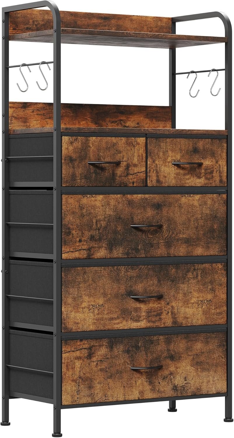 5 Drawer Storage Capacity: 5 chests of drawers to conveniently organize your clothes, pants, socks, sunglasses, books, small toys and more. The tall dresser drawer can be organized and effectively classified; 5 drawer dresser can keep the room clean and tidy and save space. The size of the drawers can be interchanged according to your preferences.