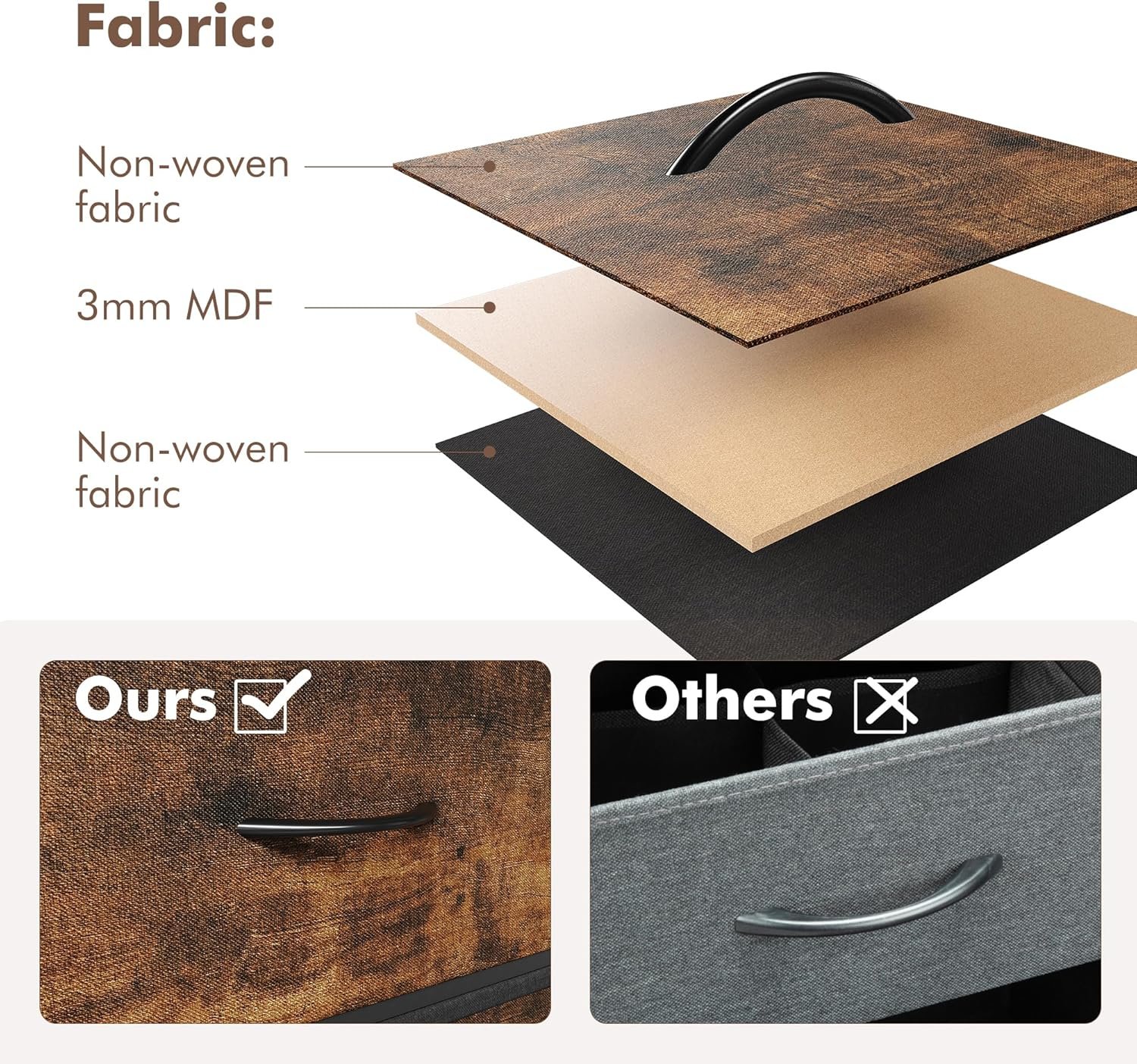 Sturdy and Durable: The sturdy steel frame and waterproof wood top ensure years of use. Heavy-duty metal frame with X-frame backing and wall anti-tilt kit enhances the stability of this fabric dresser. Adjustable feet on the bottom can adjust balance, enhance stability and protect your floor from scratches.