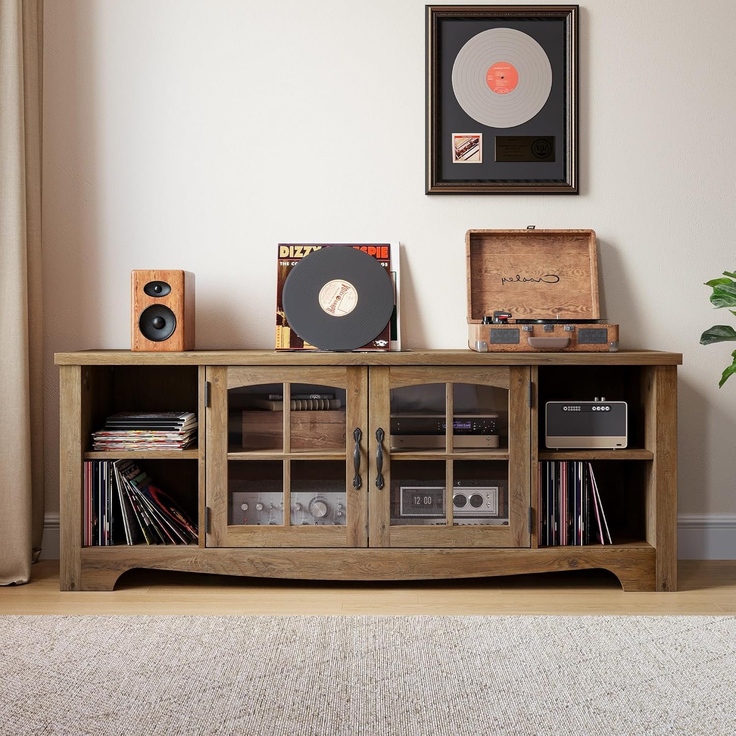 Cord Management – Keep cords tidy with cable cutouts in the two layers of cabinets on this farmhouse TV stand. The oak wood grain and glass doors add a modern yet traditional touch to your entertainment space.