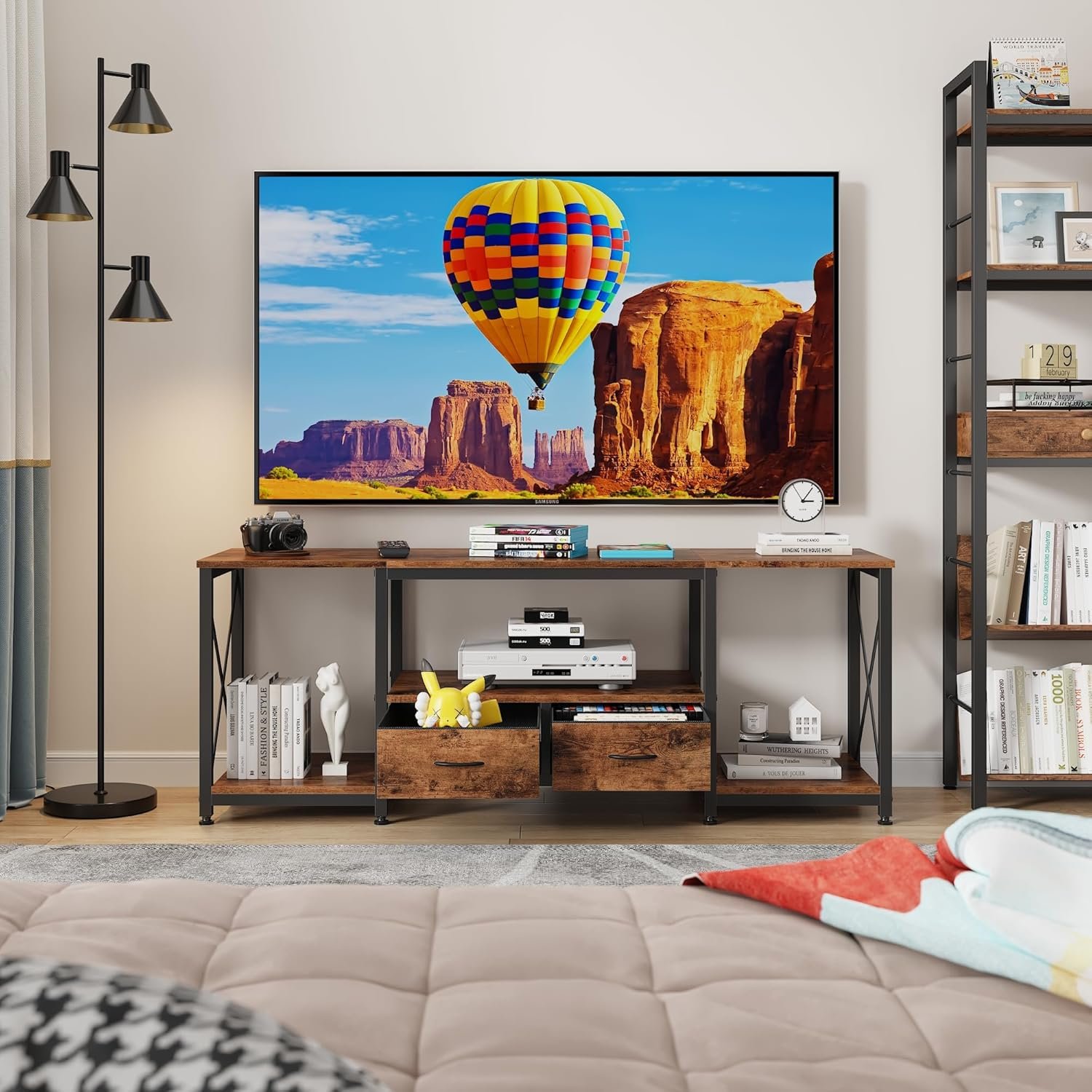 TV Stand with Fabric Drawers for 65 70 75 Inches TV – Entertainment Center and Industrial TV Console Table with Open Storage Shelves for Living Room, Bedroom – 63″ Rustic Brown