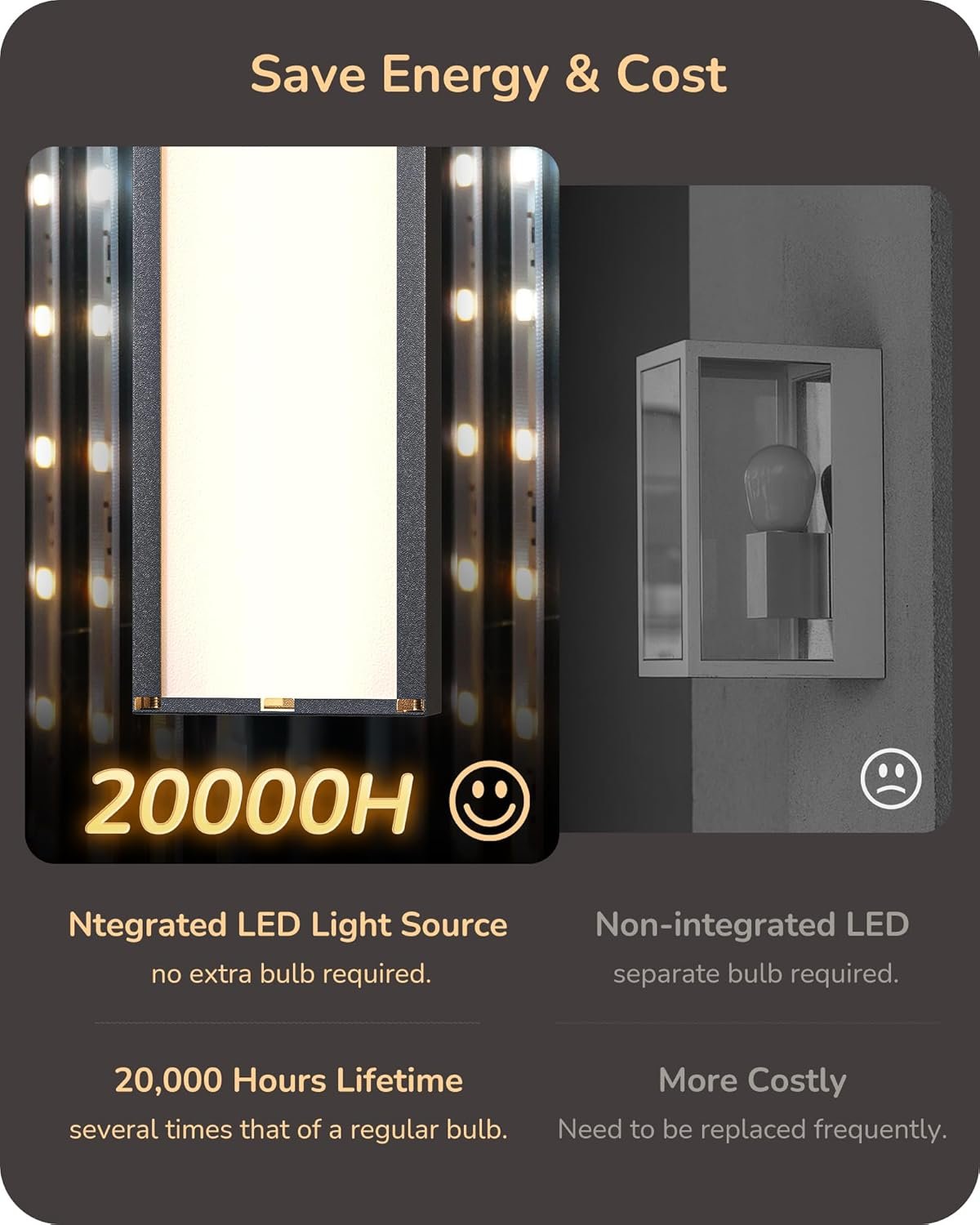 [LED Light Source & Long-lasting] No bulbs needed, integrated modern outdoor wall lighting with built-in LED light source for low energy consumption, up to 20,000 hours lifespan for durability and savings; backlit for softer glow, no glare and no flicker.