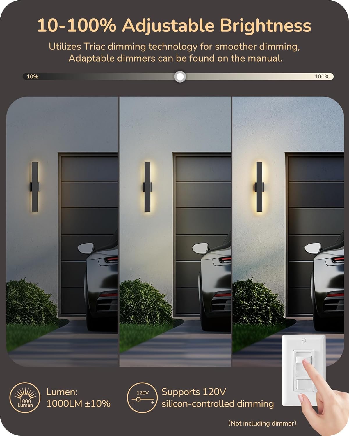 [Smooth Dimming] 10% to 100% dimming, customizable brightness to suit various settings; long modern outdoor wall light use Traic dimming for compatibility with most dimmers (not included), support 120V SCR dimming, ensuring smooth, gradual lighting adjustments.