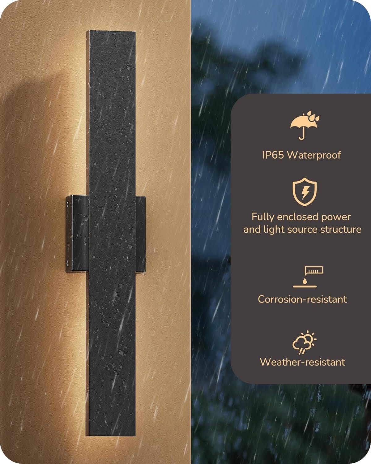 [Weatherproof for Outdoor Use] IP65 waterproof, independent waterproof structure for power and light source, drainage holes on both ends of the lamp prevent water accumulation; made of premium iron and PC material, corrosion resistance and durability in harsh weather; ideal for outdoor/indoor use, such as entrances, porches, garages, hallways, etc.