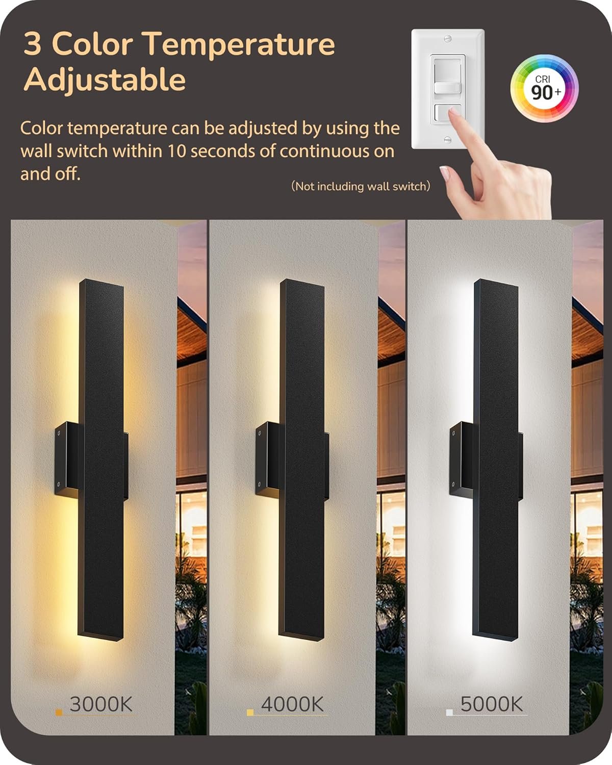 [3 Color Temperatures Available] 3000K/4000K/5000K, warm to bright lighting for different environments; CRI 90+, these led outdoor wall sconce ensure accurate color representation; use a wall switch (not included) to adjust the color temperature by switching on/off continuously within 10 seconds. If the color temperature is inconsistent after power on, just turn it on/off twice within 1 sec.