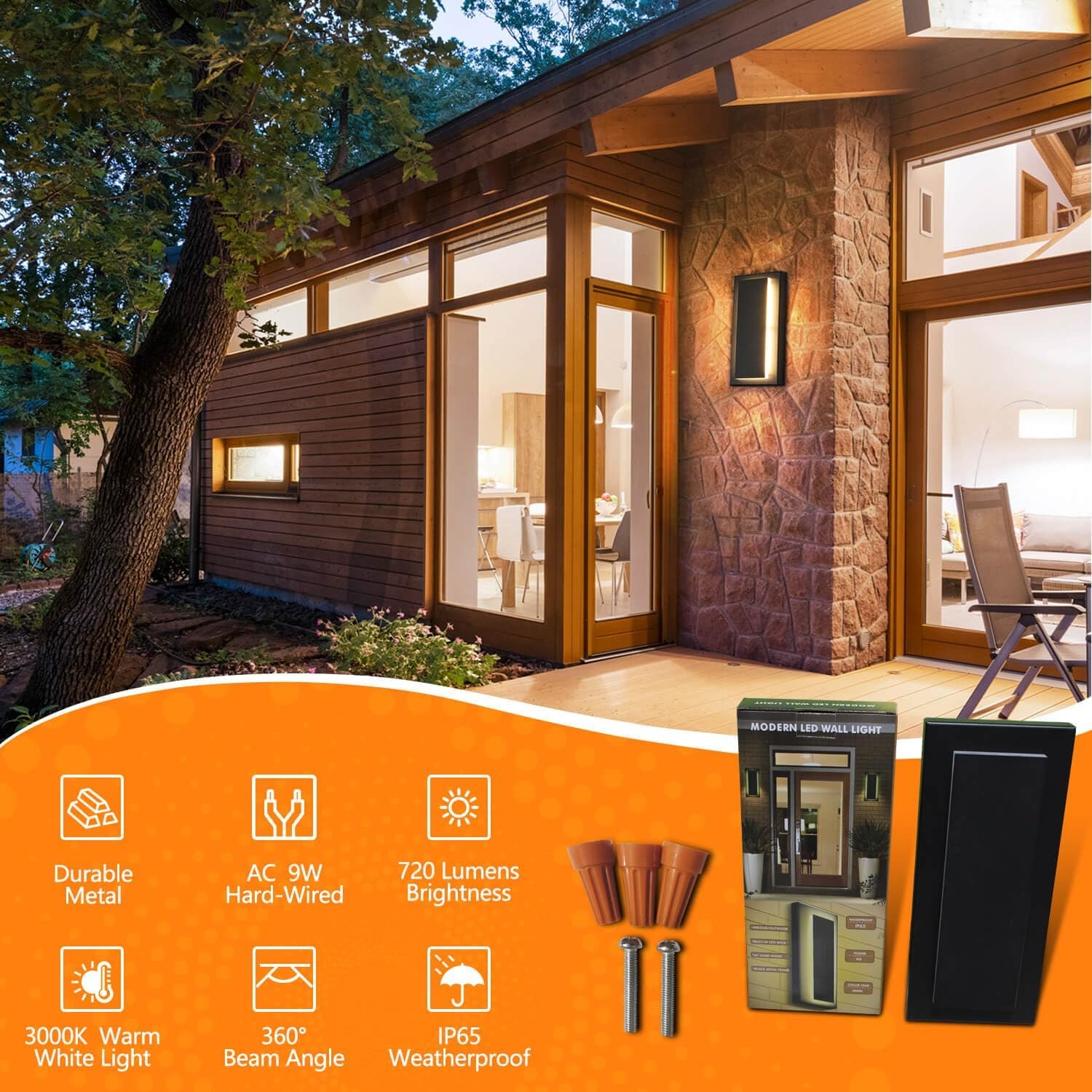 HIGH QUALITY MINIMALIST WALL LIGHTS: Modern outdoor wall lights made of sturdy metal frame and base. Standard U.S. installation, AC120V 9W hardwired. Waterproof acrylic lampshade protects the LED wick making it work in heavy rain, snow and windy weather