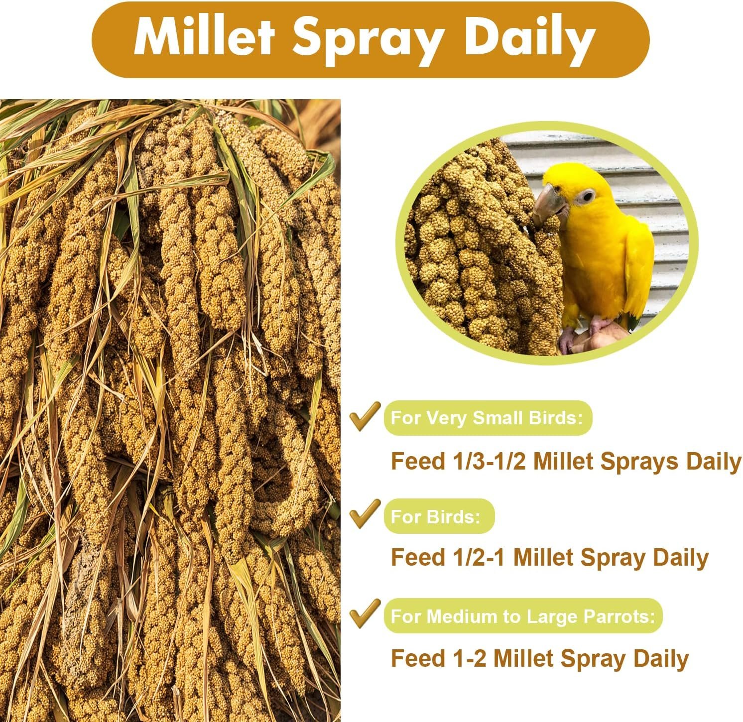 LARGE AND FULL: 1 LB spray millet, length is about 12.6 inch. Bird millet is free from pesticides and preservatives, suitable for pets birds and wild birds, ensuring that not only will you get a good value for your parakeets, parrots, budgies, cockatiel, you won’t run out quickly