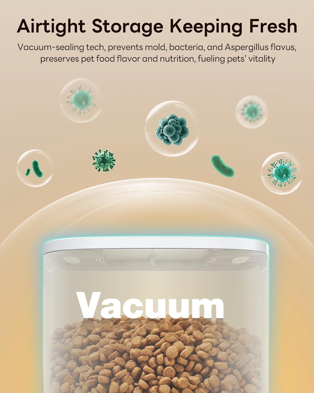 🛎️【Revolutionary Automatic Evacuation, Every Meal is 100% Fresh】Dokoo’s automatic dog food dispenser has unique vacuum sealing technology, creates a low-pressure, low-oxygen environment to inhibit oxidation by using a vacuum pump to pump out air and lock lid on the top, firmly locking the top of the granary, completely isolating the air and keeping every kibble fresh like just opened. The original nutritional value and crispy taste are maintained to allow fur companions to always have healthy meals.