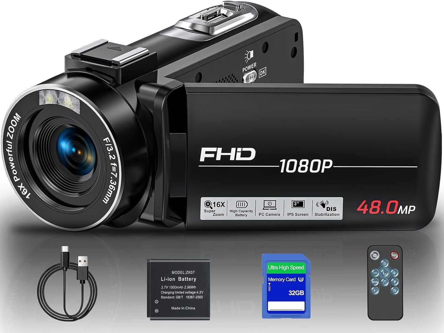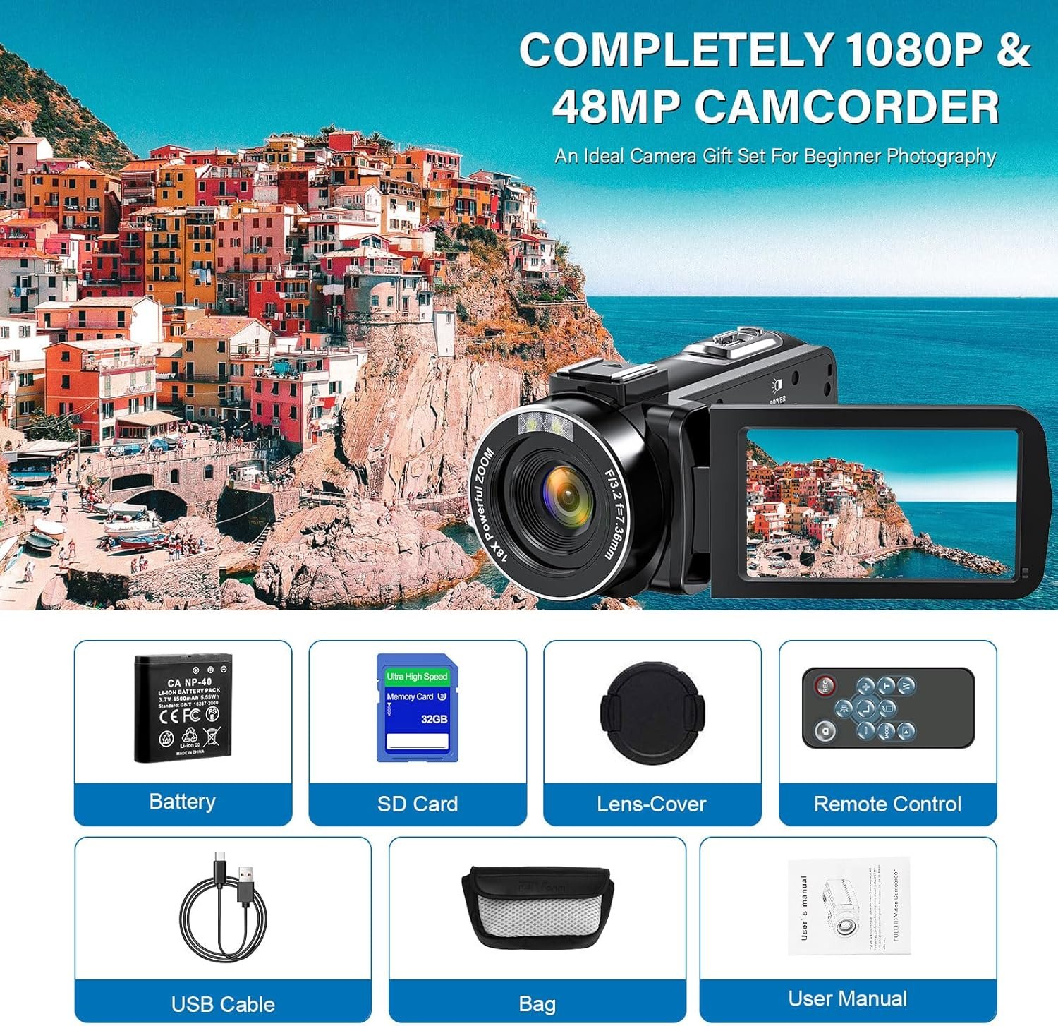 HD 48MP 1080P Video Camera Camcorder: This video camera supports up to 1080P video resolution and 48.0MP image resolution. The 16X digital zoom can enlarge the picture to capture all the important details. It excels at bringing distant subjects closer, ideal for sports, weddings, or travel vlogging. Equipped with a 3-inch IPS high-definition screen, it allows for intuitive control, making it an ideal digital camera for capturing family milestones and vlogging camera. Additionally, the camcorder comes with a 32GB SD card, ready to use right out of the box.