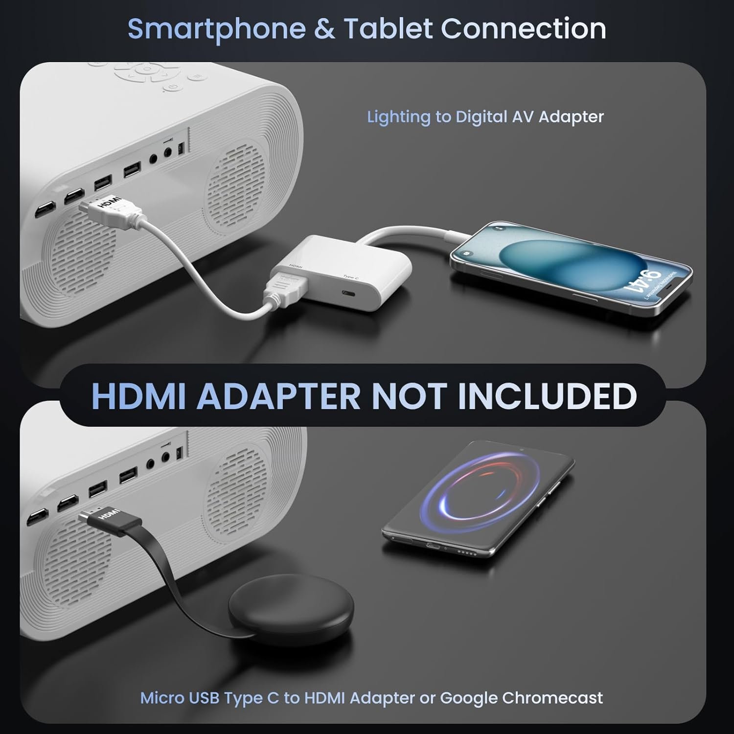 【Phone Projector with Wide Compatibility】:Equipped with HDMI, AV, USB, 3.5mm headphone interface, the smart projector is compatible with TV Box, TV Stick, Laptops, Tablets, USB Flash Drive, etc. it’s compairble to multiple devices to meet most daily home theater requirements—Home Theater, Video Game, Party, Apartment
