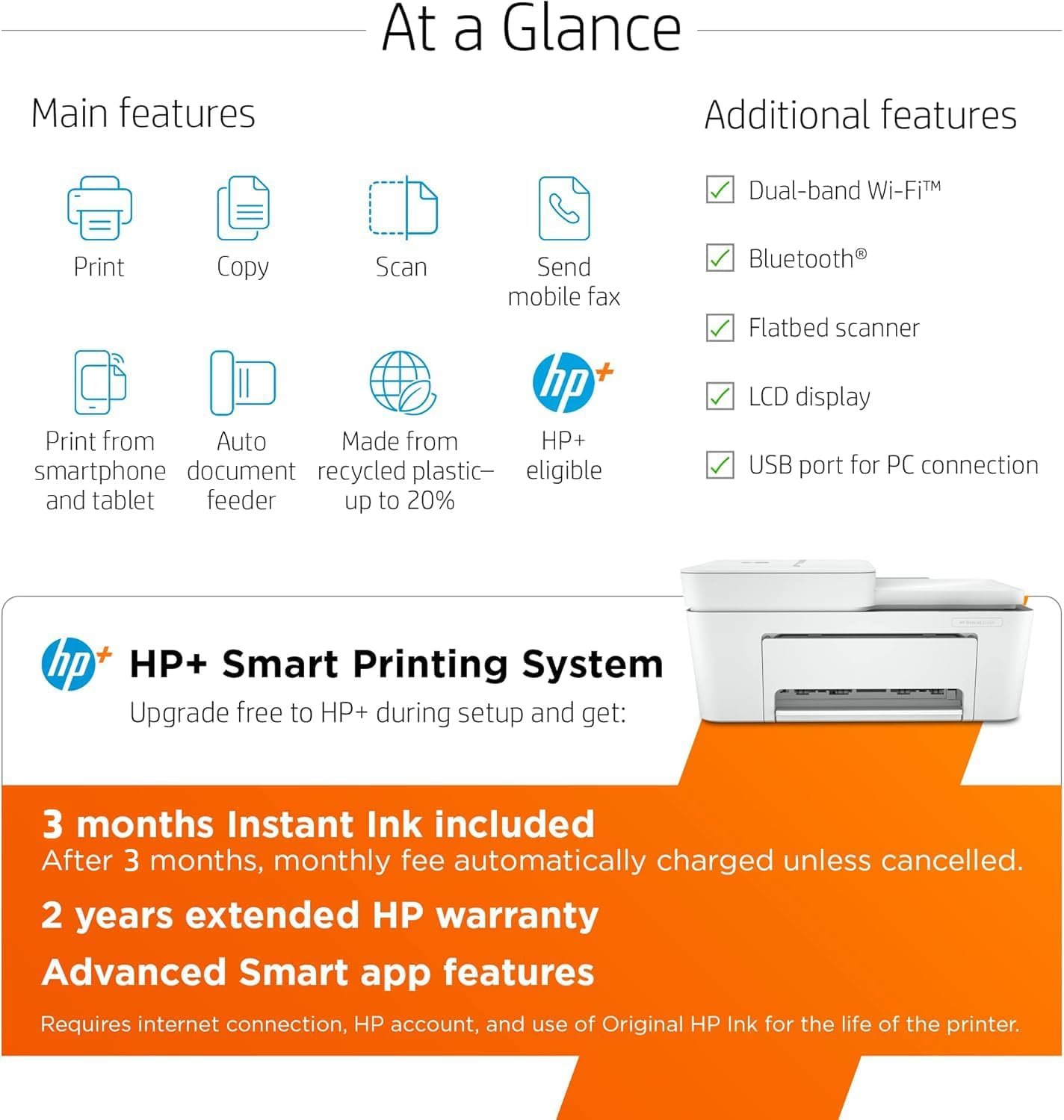 The HP DeskJet 4155e has the essential features you need to print basic color documents like recipes and forms. Print, copy and scan with ease, print from your phone and get easy setup. Includes the optional HP+ Smart Printing System that keeps itself up to date and ready to print from virtually anywhere at any time—at no additional cost.