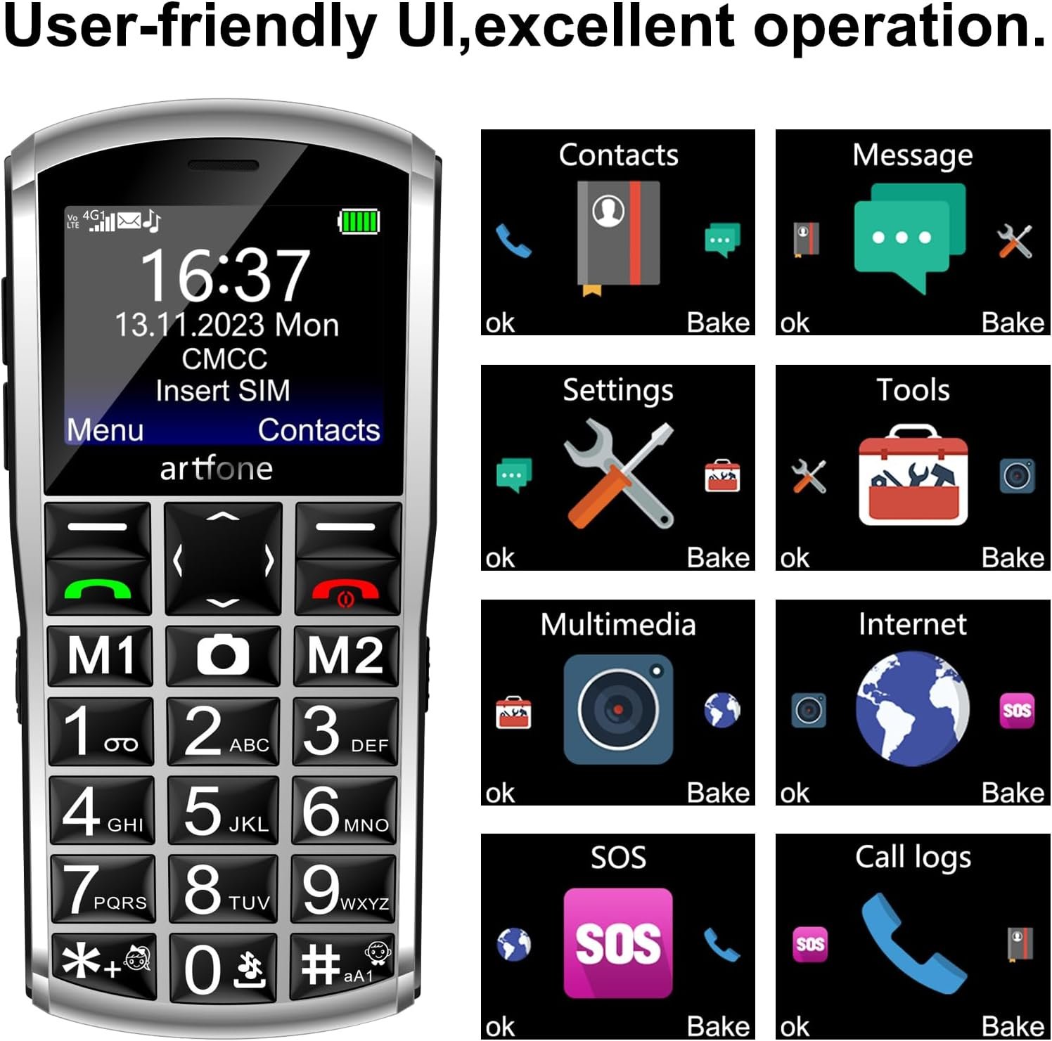 【User-Friendly Unlocked Phone with Big Buttons】The artfone A400, featuring a UI operating system, is a large-key senior phone with a raised backlit keypad designed to meet the tactile needs of the elderly. The prominent red and green buttons make dialing and texting easier, reducing errors. This keypad phone is a no-contract device that does not support internet browsing. Beyond basic functions like alarms and radio, it is exclusively designed for calls and SMS