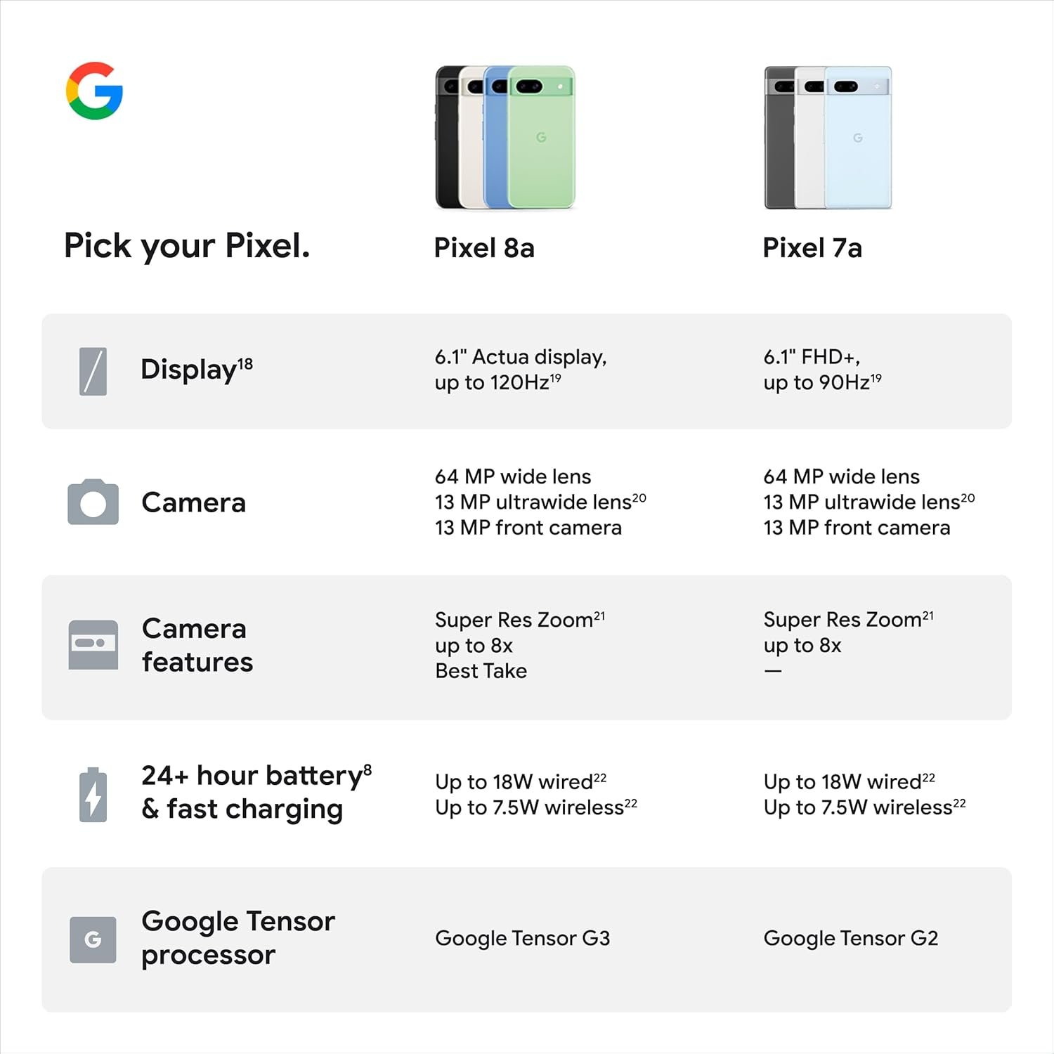 Meet Pixel 8a. It’s engineered by Google with powerful security and the incredible Pixel Camera. With Google AI, you can do more, even easier – like fix photos, screen calls, and get answers.[7] And it has an all-day battery, so you have power when you need it most.[8] All at a great price.