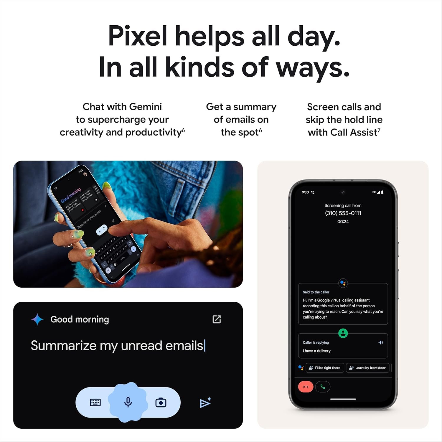 Google AI helps with everyday tasks; search anything right from the app you’re in, just by drawing a circle around an image, text, or video[5]; get a summary of emails and brainstorm ideas with Gemini[6]; and avoid spammers with Call Assist[7]