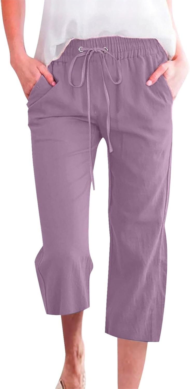 Capri Pants for Women Casual 2025 Summer Drawstring Elastic High Waist Linen Pant Straight Wide Leg Cropped Trouser