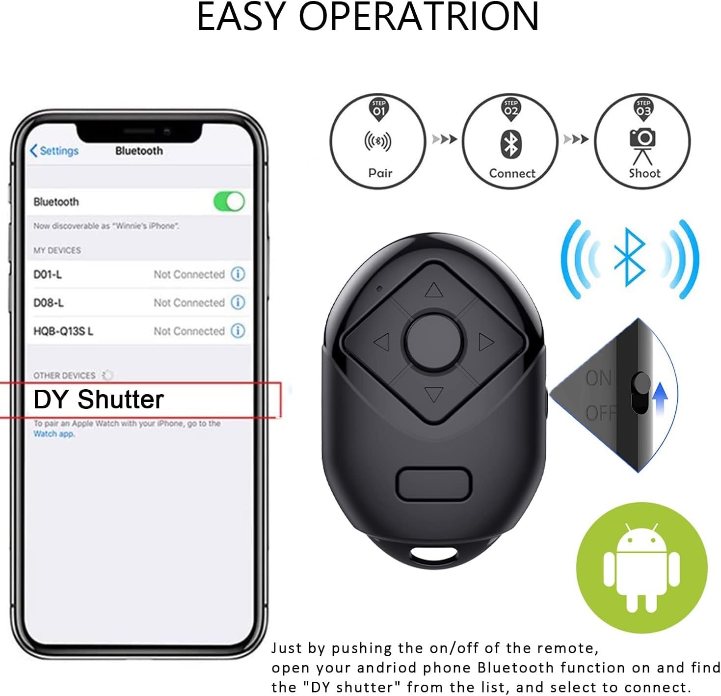 EASY OPERATION WITH 30FT OPERATION: Just by pushing the on/off of the remote, open your phone Bluetoo function and find the “DY shutter” from the list, and select to connect. Then open Tiktok or E-book APP, enjoying the operation. (detail instruction please see our user manu in package), operational distance up to 30 feet (10m).